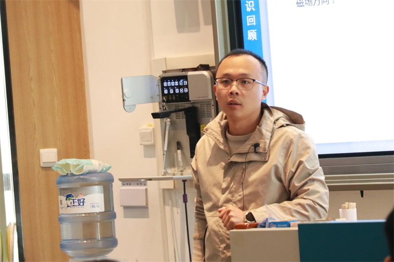 郭成初老师带来《磁感应强度磁通量》一课,针对高二学生已具备一定物理基础,但对“磁场”这类抽象概念仍存在理解障碍的学情,郭成初老师采用“类比迁移+分层突破”的教学策略,展现出深厚的教材把控能力。在“磁感应强度矢量叠加”的例题教学中,他不仅带领学生用安培定则判断各电流在某点的磁场方向,还总结出“先定方向、再用平行四边形定则合成”的解题步骤,并通过“三根平行直导线的磁场叠加”“垂直放置导线的磁场分析”等变式训练,让学生熟练掌握方法。课前,他还组织备课组开展多轮磨课,针对“如何将抽象的磁场转化为直观的图形”“如何设计分层任务适配不同基础学生”等问题反复研讨,最终呈现的课堂既兼顾知识深度,又具有极强的可操作性。