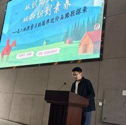 继李明熙同学的精彩分享后,高二(4)班吕润凯同学以“我的假期生活”为主线,生动讲述了从高一到高二的成长历程。他回顾了从青涩懵懂到从容不迫的心路转变,并分享了在假期中“松弛与奋进”的学习节奏。通过“文游青岛”的实践经历,他诠释了“读万卷书,行万里路”的深刻内涵,展现了新时代学子知行合一的精神风貌。